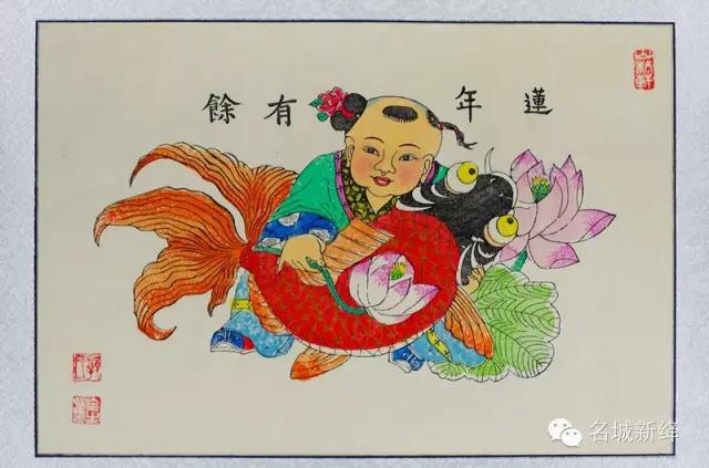 年画是纯百姓的艺术,常用谐音比拟的手法,将毫不相关的事物用浅显的谐音效果表现出来,便于世人接受。如"连生贵子",用莲(连)、笙(生)的谐音来比拟。"福从天降",用蝠与福的谐音,画一蝙蝠从天而降来体现。用柿(事)鸡(吉)玉如意(如意)来表现"事事吉祥如意"。